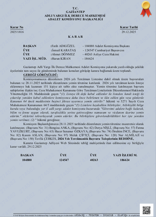 2026 Yılı Kesinleşmiş Tercüman Listesi ve Başkanlığımızın Kararı